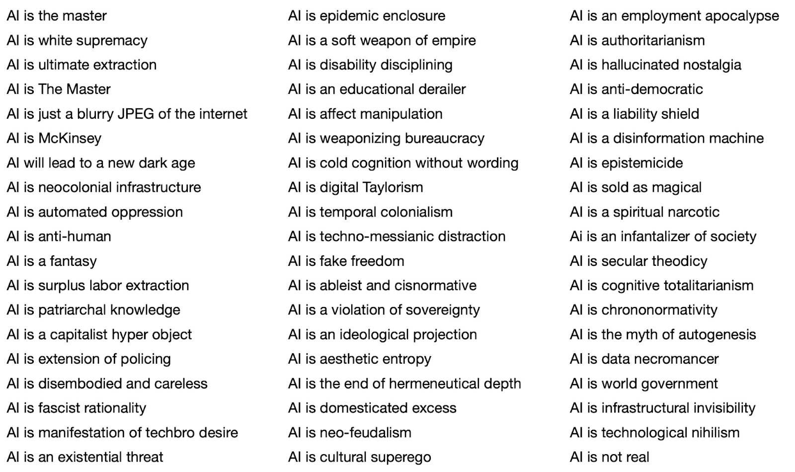 The same terms used to vilify nuclear power — “techno-fascist,” “extractive,” “existential risk,” “Promethean madness” and “fantasy”— are now regularly voiced by today’s Critique Industry to describe AI. To map the territory, I collected some of the greatest hits from contemporary academics in the humanities.