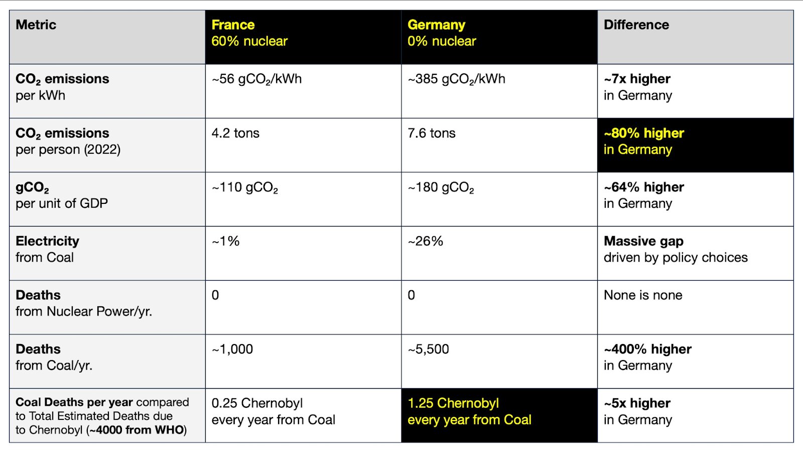 One can discern the impacts of Germany shutting down its nuclear plants for environmental, health and safety reasons by comparing it with France, which gets roughly 70% of its electricity from nuclear power. The results are stark and, spoiler alert, bad for Germany. Germany’s average CO2 emissions per kWh today are seven times higher than France’s, and its CO2 emissions per person are 80% higher. Germany turned to solar and wind (great) and oil and gas (not great) for electricity, a transformation that has had extremely negative health effects. It now gets roughly 25% of its electricity from coal (France is close to zero). Because of this disparity, Germany tolerates roughly 5,500 excess deaths from coal-related illness annually, while France’s number is closer to 1,000. That’s 450% higher.