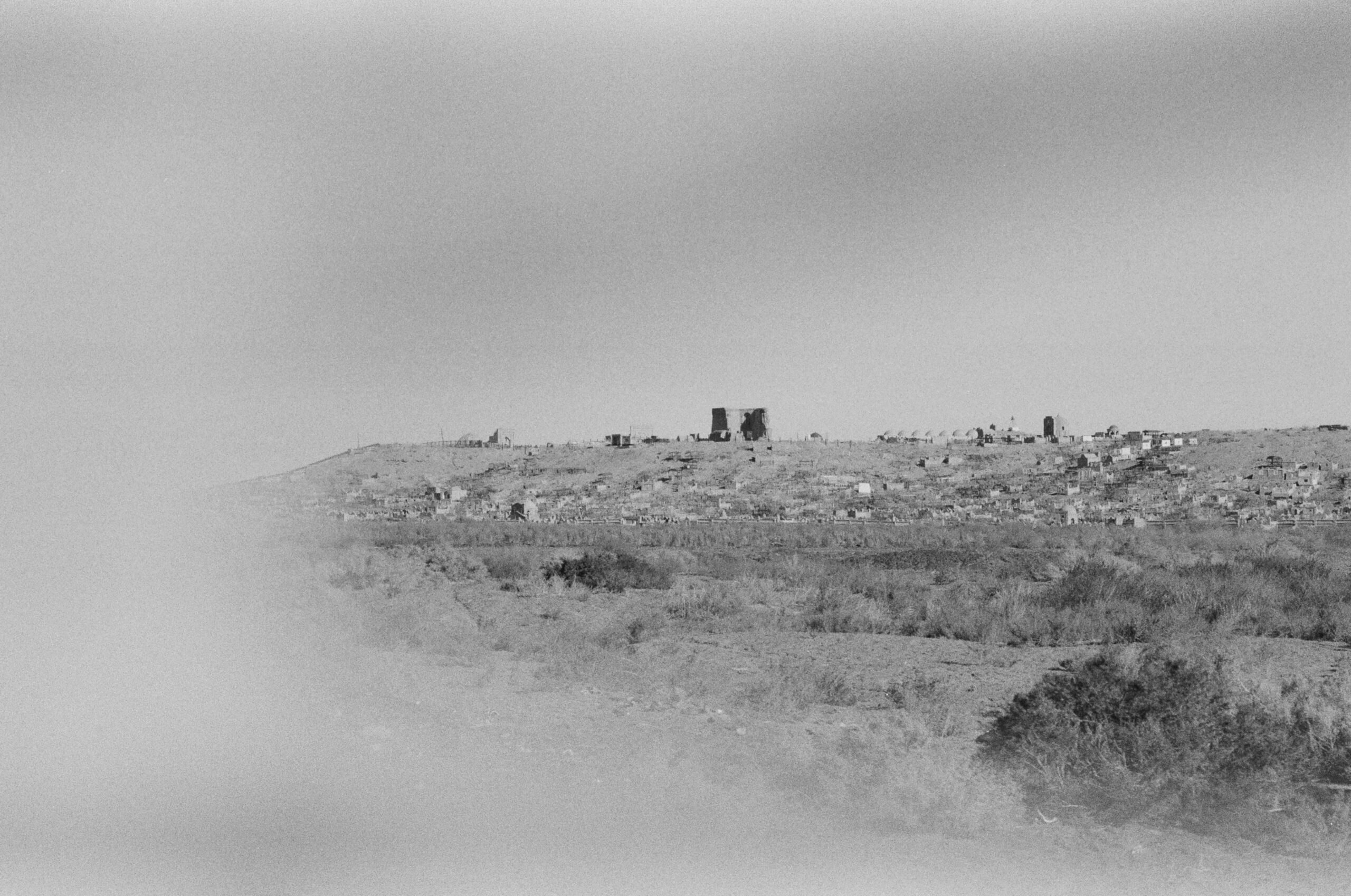 The necropolis of Mizdarkhan, 13 miles southwest of Nukus, sprawls over three low hills rising from the yellow steppe. It is the place of the first human and the end of days. My first impression is of an abandoned termite mound. Two thousand years ago, it was very much alive, one of the largest cities in the oasis region of Khwarazm. At some point, the living fled and the dead moved in. It still has an eerie feeling of being occupied; the mausoleums resemble houses, the spaces between them winding streets. Some modern tombs are modeled after yurts with curving ribs of rebar. Propped against walls like ladders are the wooden frames often used to carry corpses to their final resting places. Many of the simpler graves have collapsed into gaping holes — it feels as if the dead clambered out and went for a walk, wandering like dust devils among the fallen brickwork.