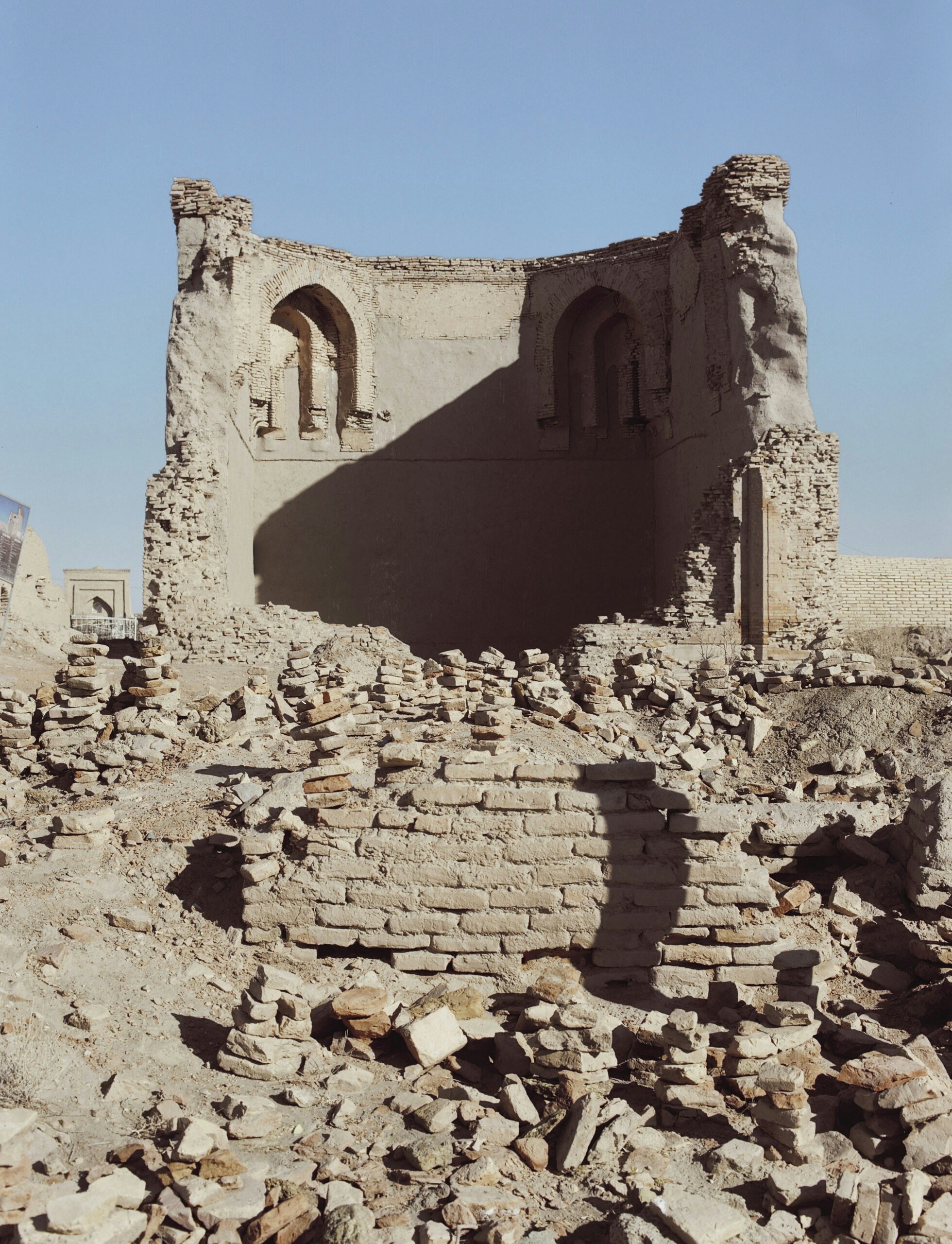 Not far away, past crumbling graves and cairns of mud bricks stacked in sevens — an auspicious number in the comparatively recent religion of Islam — stands another monument, a ruined mausoleum. Its roof long ago collapsed, and only three slumped walls remain. According to tradition, one brick falls from it every year. It is dedicated to Khalif Erejep, a medieval Sufi saint, but pious Muslims believe it is built on top of Adam’s grave, a cosmological rival to the tomb of Gayōmart.