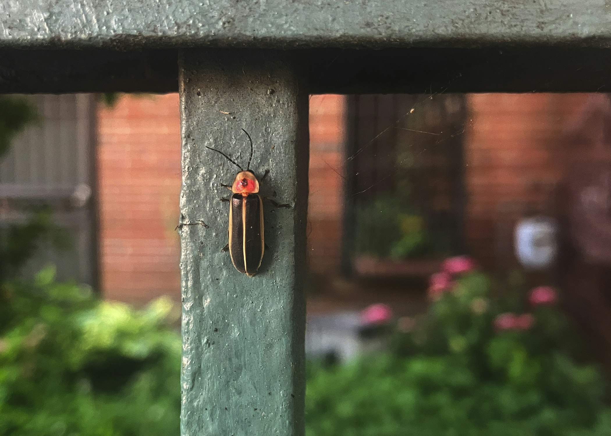 At first, I thought it was a strand of fairy lights twining up a neighbor’s tree. But the light wasn’t steady enough — this was more flicker than glow. Then I looked more closely at the neighbor’s wrought iron fence. A single orange-and-black firefly was perched on top of it. It flashed once, then spread its wings and vanished into the fading light.